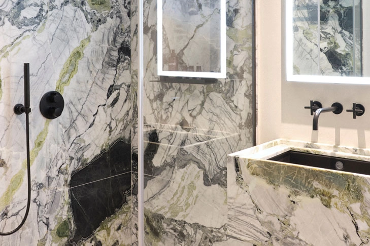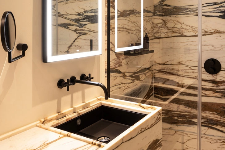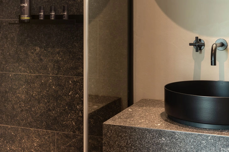 For the bathroom design of the Château, the choice fell on the Alape basins Metaphor and Unisono and the Dornbracht icon TARA in Matte Black . In addition, several design mirrors and the Assist shelfing system decorate some bathrooms. Fittings and basins harmonize perfectly with the expressive marble. The color, grain and texture of the stone and the exclusive, Matte Black finish of the TARA and the Alape basin seem to be made for each other.