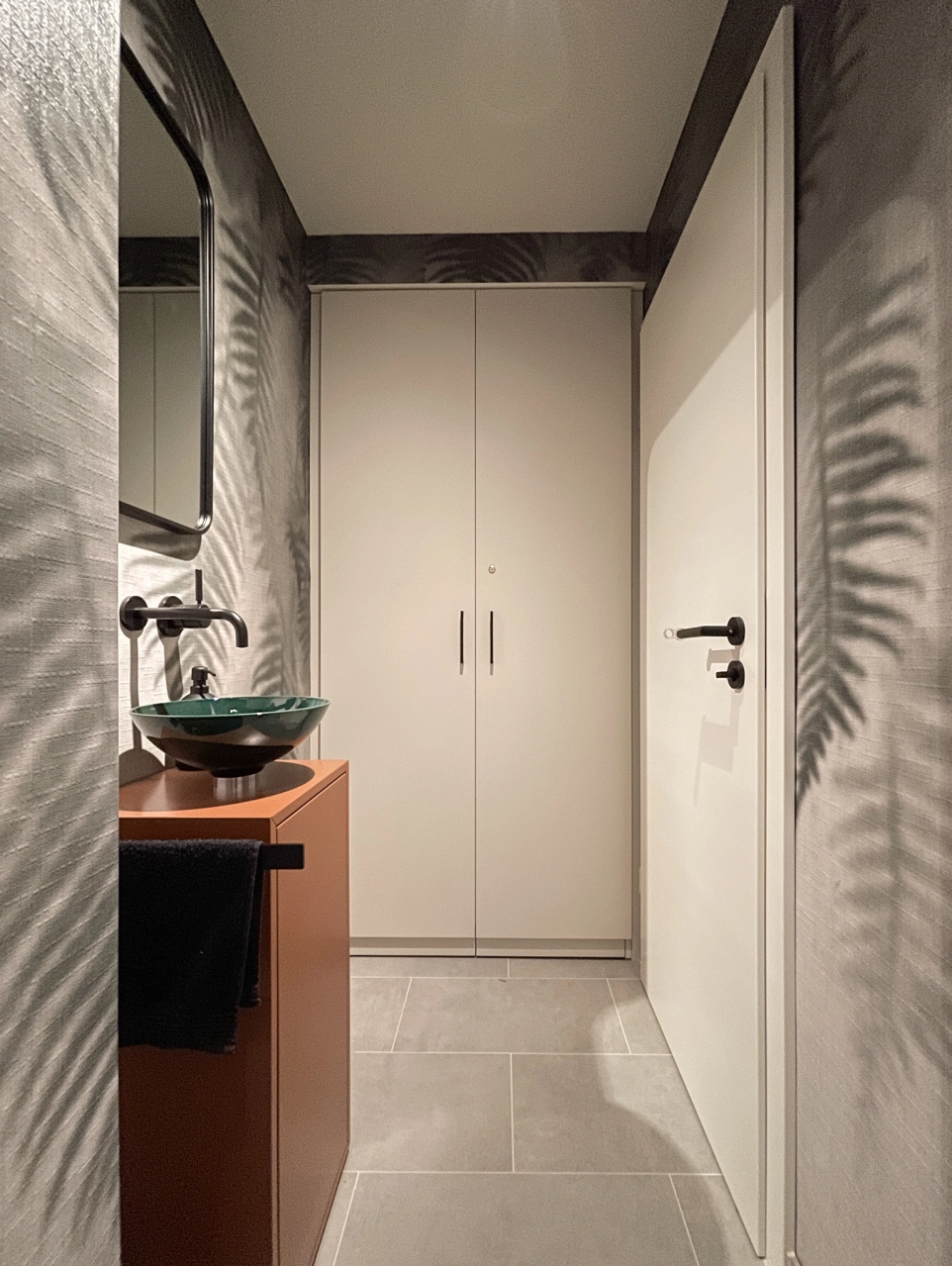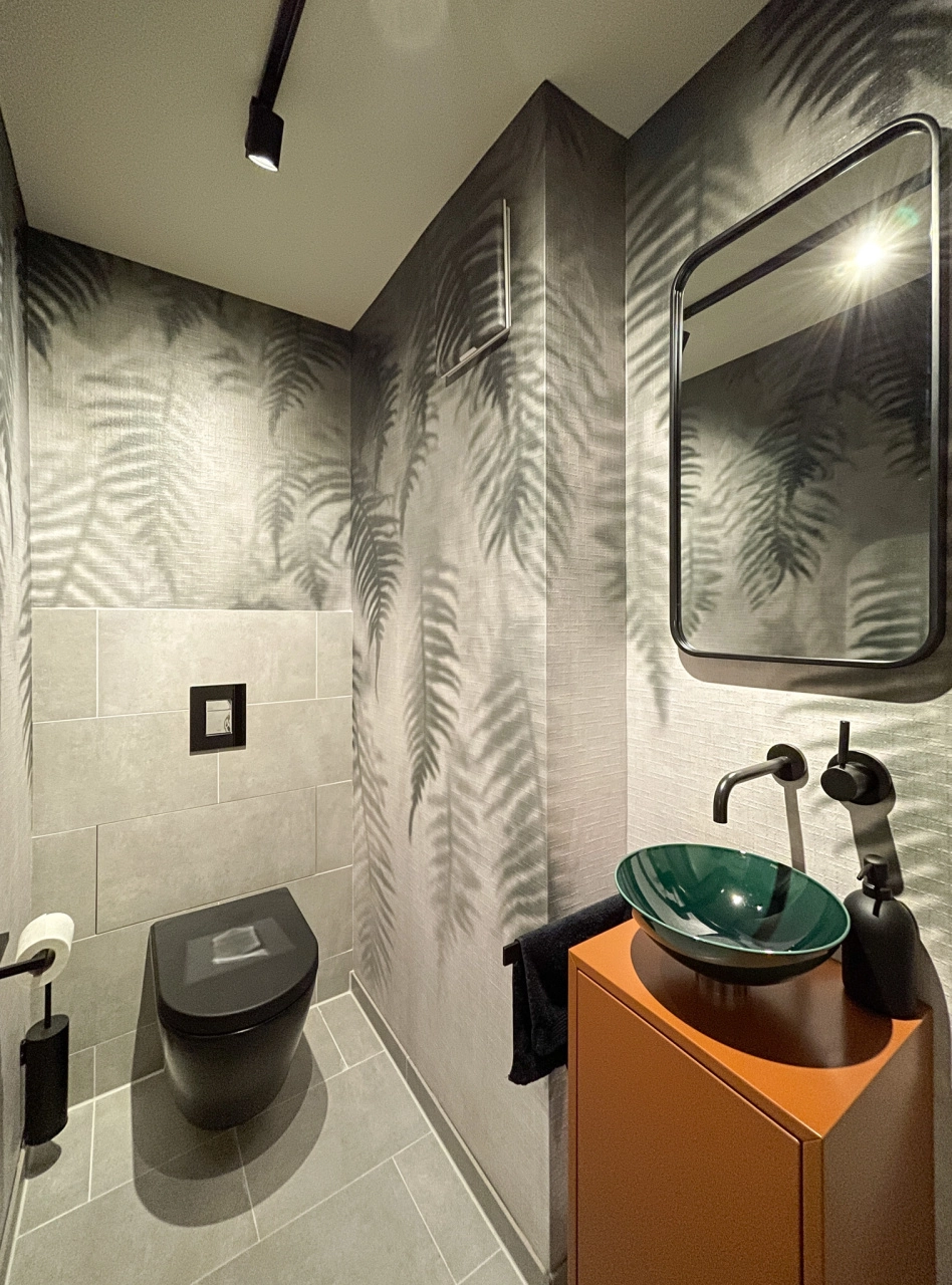Il était important pour « hell und freundlich », le bureau d’architectes chargé du projet, que l’aménagement de toutes les pièces soit axé sur le confort. La salle de bains donne également un sentiment de sécurité. Le sol et une partie d’un mur sont recouverts de carreaux de pierre naturelle gris clair. Le papier peint à motifs des autres murs est également gris, mais présente des feuilles de fougère suspendues dans différentes teintes. Il crée l’impression d’une jungle tropicale dans la brume. La vasque Aqua d’Alape a été choisie pour le lavabo. La profondeur visuelle de la finition est captivante et fait ressortir le meilleur de l’acier vitrifié. L’irisation vert foncé de la couleur Deep Green donne un ton subtil et coloré, facile à associer au concept de jungle implicite. Comme la façon dont les couleurs passent dans la vasque pendant le processus de fabrication varie toujours légèrement, chaque vasque est unique.
