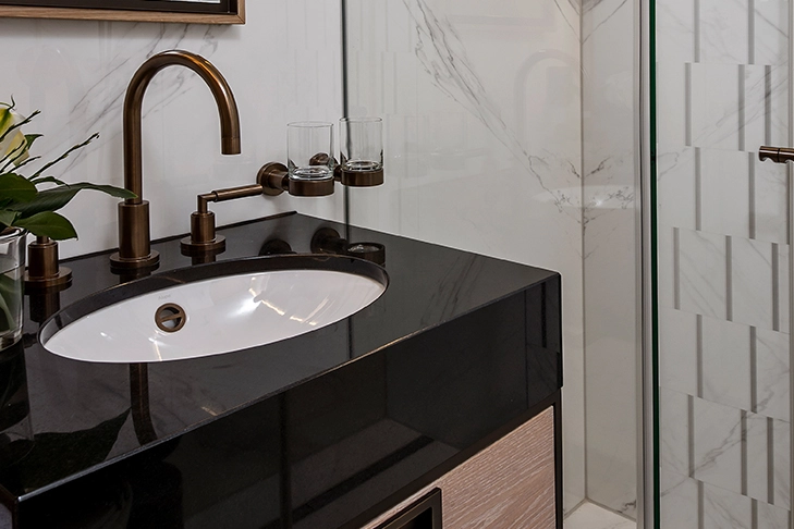 Des vasques à encastrer par le dessous ont été installées dans les salles de bains du boutique-hôtel de Zurich. Dans ce type d’installation, les vasques sont collées sous le plan, créant ainsi un joint invisible. Il en résulte une liaison précise entre les deux éléments – sans qu’il soit nécessaire d’ajouter du silicone. Le poids relativement faible de l’acier vitrifié constitue donc un avantage important. Sur le plan optique, les vasques s’intègrent parfaitement dans la conception des plans de toilette et se subordonnent. Les lavabos encastrés sont vitrifiés à l’intérieur et à l’extérieur et ne nécessitent pas de percement pour robinetterie. Ina Rinderknecht est convaincue par la qualité des produits Alape : « Les solutions de plans de toilette d’Alape sont intemporelles, robustes et élégantes. La vaste gamme de produits offre des solutions variées pour une conception de salle de bains de haute qualité et esthétique. En raison de l’installation dans un bâtiment existant, les conditions spatiales étaient parfois extrêmement limitées. Compte tenu du grand choix de vasques disponibles, il a été possible de trouver une solution adaptée à chaque configuration de pièce ».